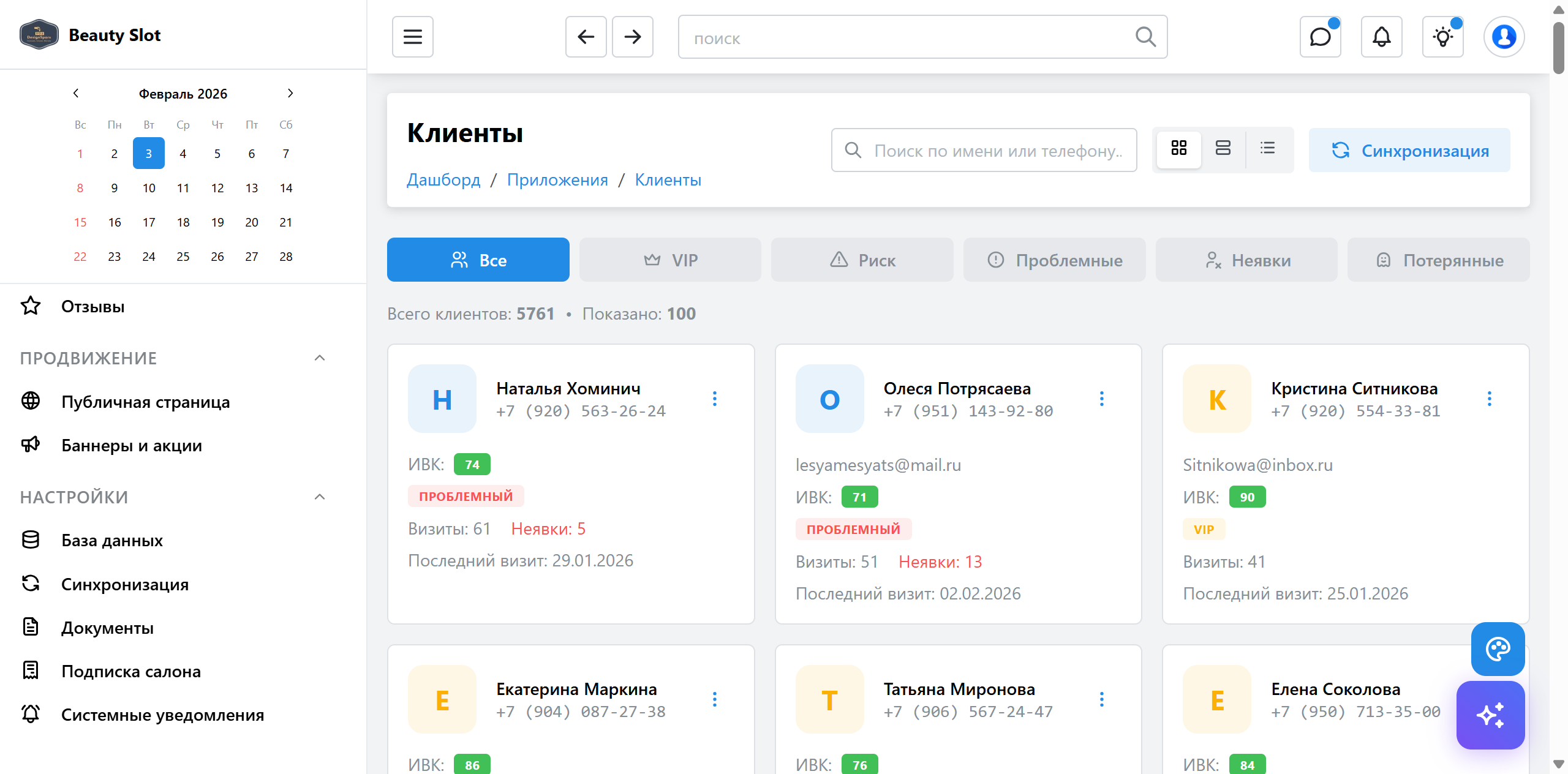 Полная CRM с историей визитов, скорингом клиентов (ИВК), сегментацией VIP/Problem/Lost и персональными заметками.